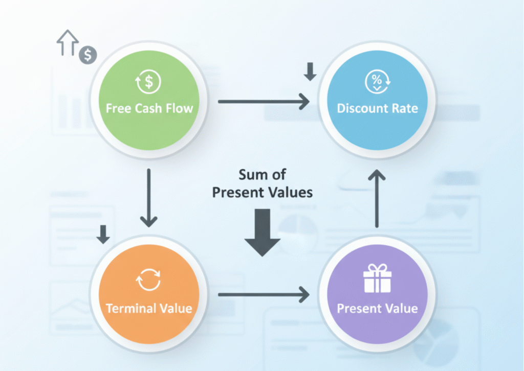 Discounted Cash Flow (DCF) is a valuation method that calculates the present value of a company’s expected future cash flows, adjusted by a discount rate. Simply put, it tells you how much a company is worth today, based on how much money it will generate in the future.